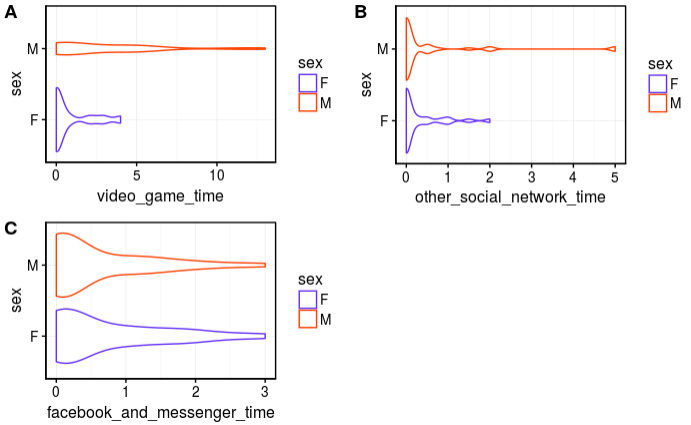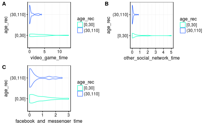 We can easily see that video game time's and other social network time's (like snapchat instagram ,...) distribution are hardly affected by the age class. Indeed young population seem to be more attracted to video game and other social network time . In comparison facebook seem to be nearly the same distribution for the two age classes facebook seem to be popular not only about young poeple but also about all the other.