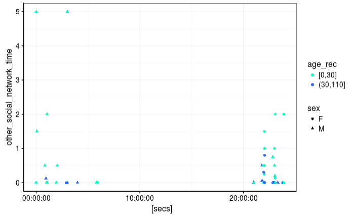 Here we do not see any relation too. Despite that we can see that the hightest value go to bed later than the other but it is not enough to say that a true relation exist and we can say that social networks seem not to affect bed time habits